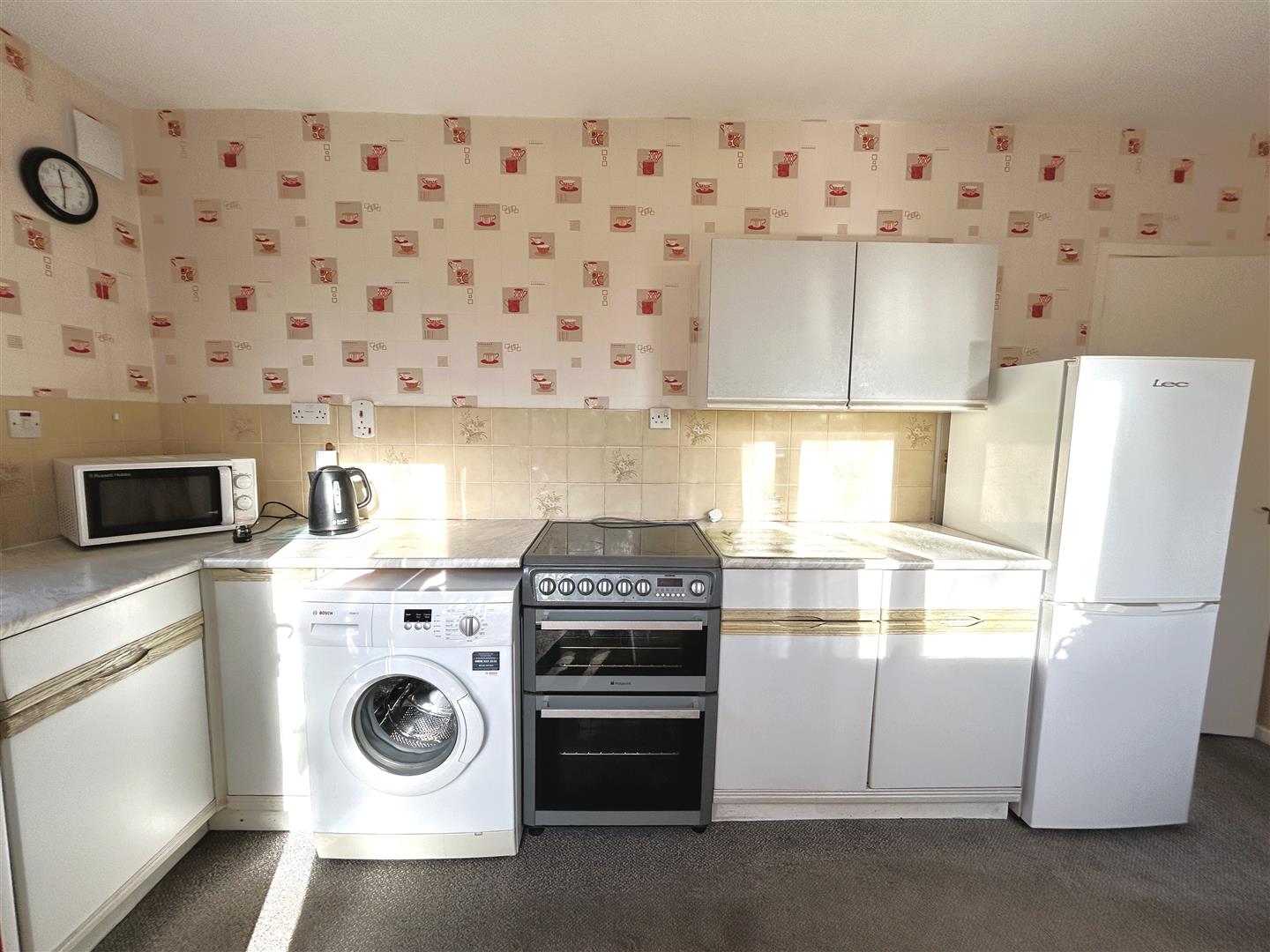 Fitted with a range of base cupboards, drawers and eye level units with marble effect rolled top work surface over incorporating a sink drainer with mixer tap and splash back tiling. There is an electric cooker, washing machine, fridge freezer, radiator, extractor fan, dual aspect UPVC double glazed windows to the side and rear and a half glazed composite entrance door allows access to the side.