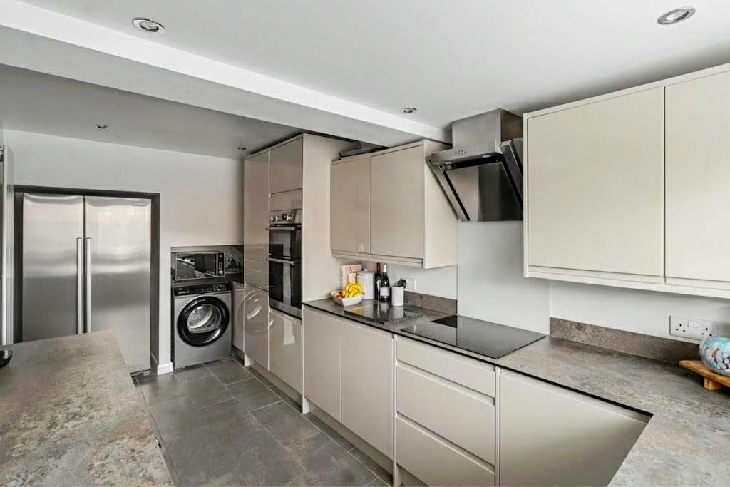 The beautifully appointed kitchen has a range of quality work surface/preparation areas, wall and base cupboards and an integrated electric double oven, induction hob and extractor over. The kitchen has an undermounted sink unit with drainer beneath a double glazed window overlooking the front elevation and there are useful kitchen drawers, space for a washing machine, integrated dishwasher, space for a tumble dryer, alcove for a American style fridge/freezer with cold water plumbing, inset ceiling spotlights and a cupboard housing boiler providing domestic hot water and central heating.
