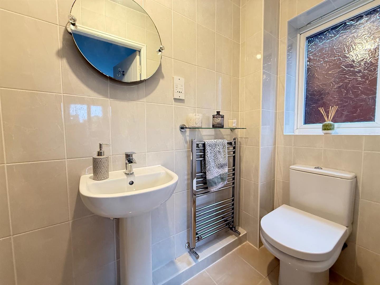 With low level WC, wash hand basin with shower cubicle, complementary tiling and heated towel rail. Frosted double glazed window.