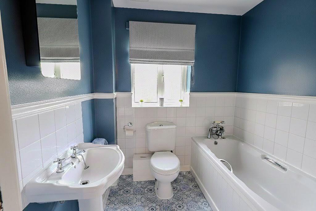 With low level WC, pedestal wash hand basin and bath with shower attachment over the bath, double radiator, complementary tiling and frosted double glazed window.