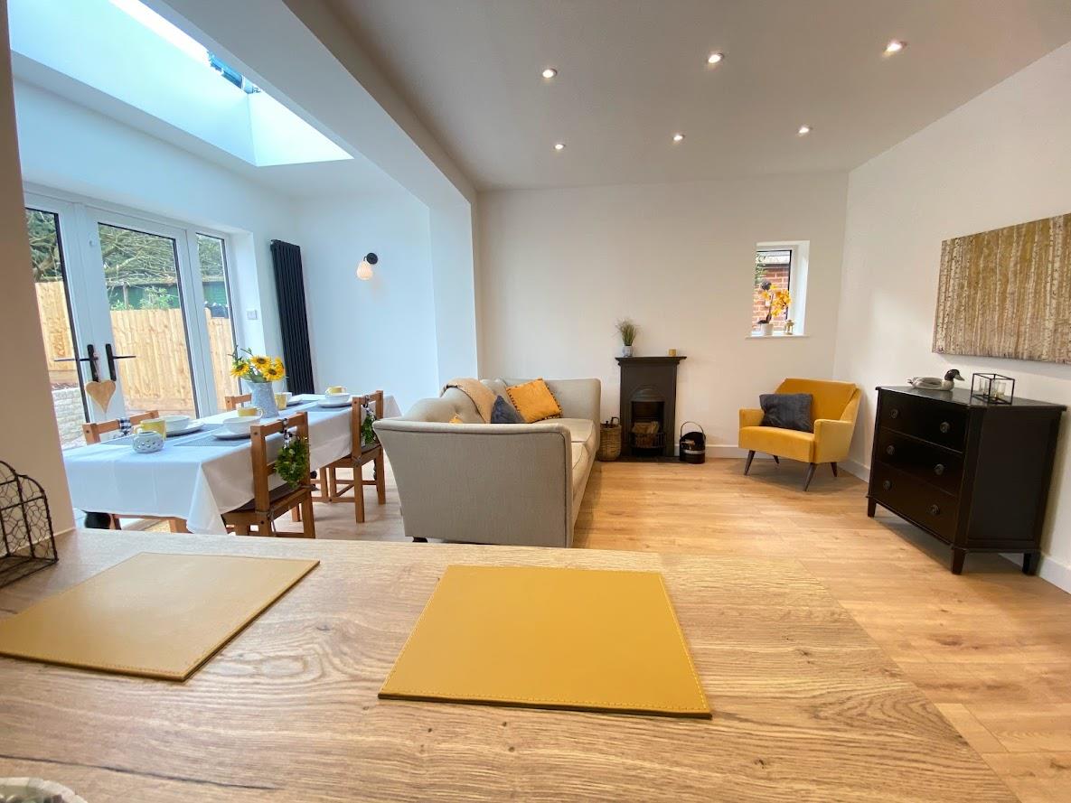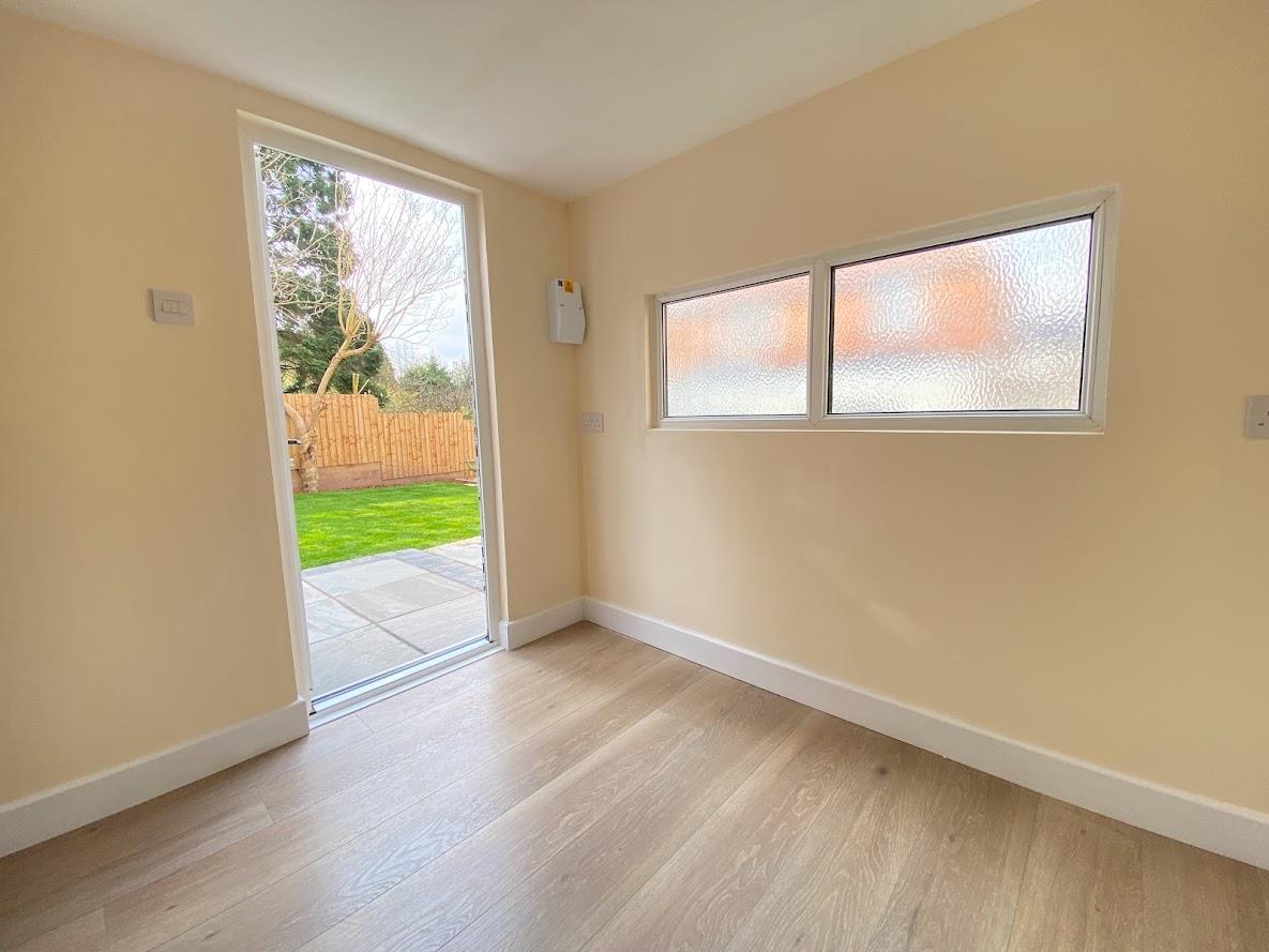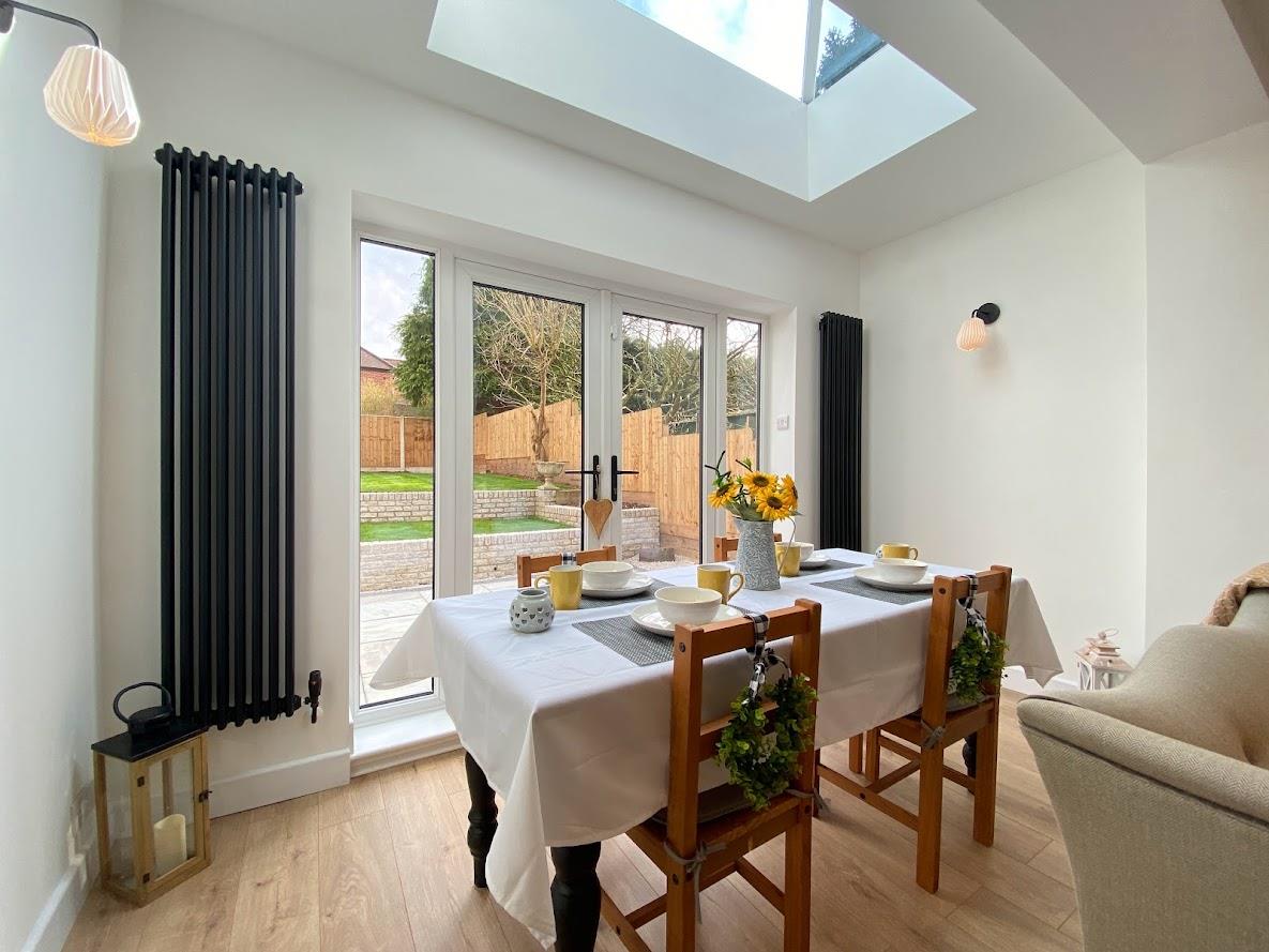A spacious area with comfortable room for dining and lounge furniture, feature fireplace in the lounge area, side UPVC double glazed window. In the dining area there is a feature roof lantern, French doors, with tall vertical radiators either side and matching wall lights.