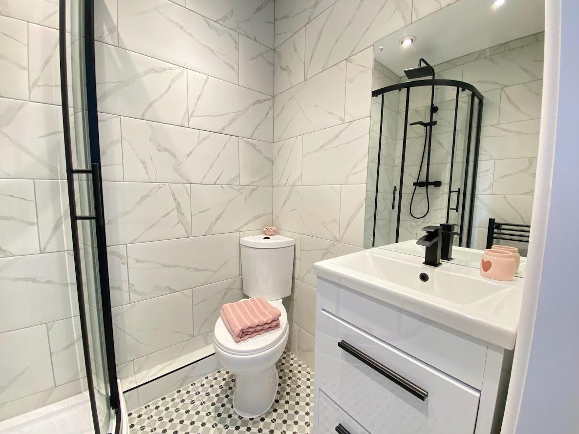 Also beautifully appointed matching the en-suite with black fittings and fitted with a bath with mains shower over and regular shower head, screen, wash basin sat on a vanity unit, WC, UPVC double glazed window, towel radiator, inset ceiling spotlights and extractor fan.