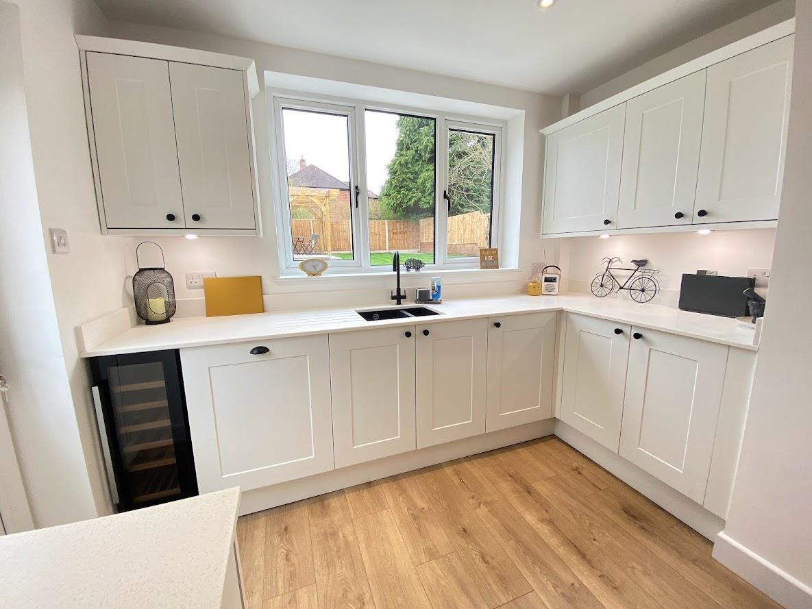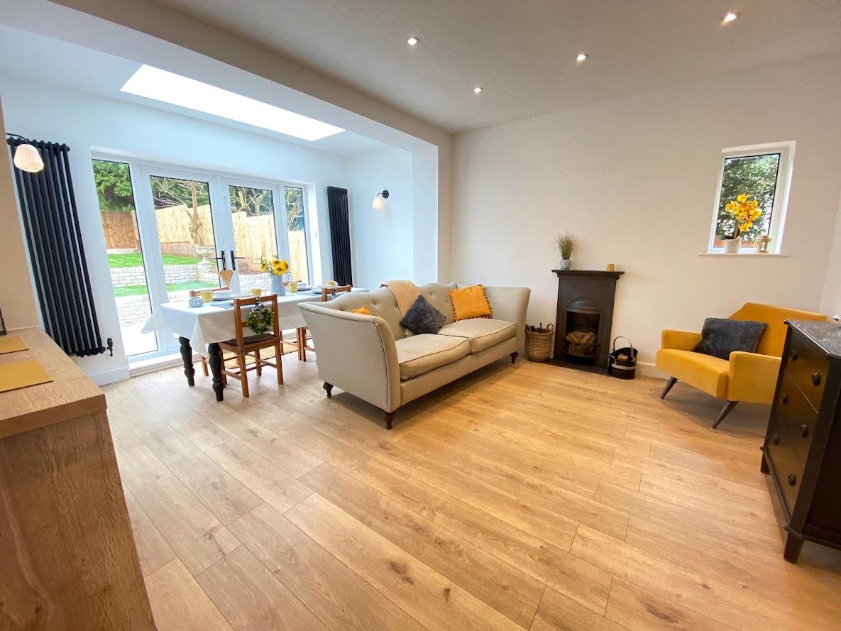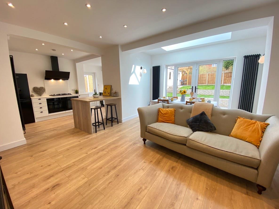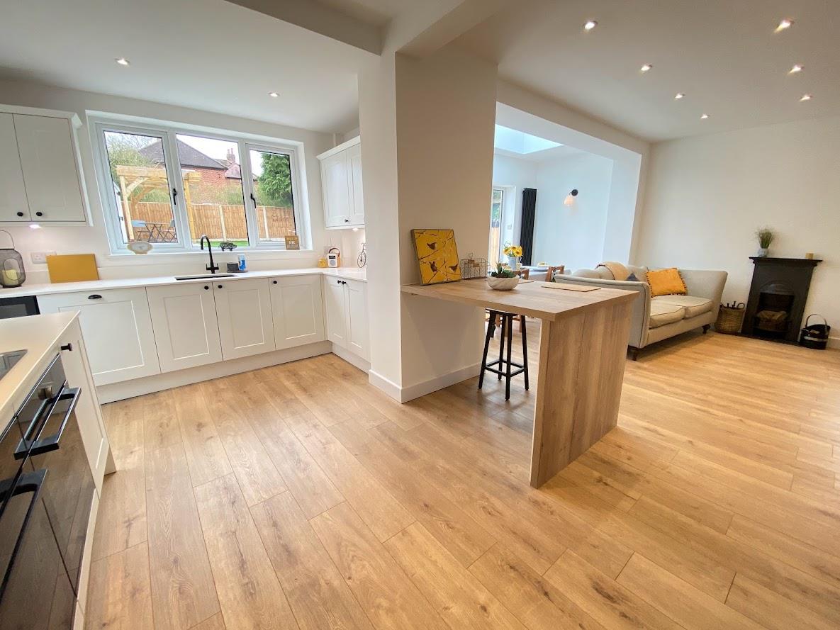 A superb open plan space with oak effect laminate flooring throughout and inset ceiling spotlights.