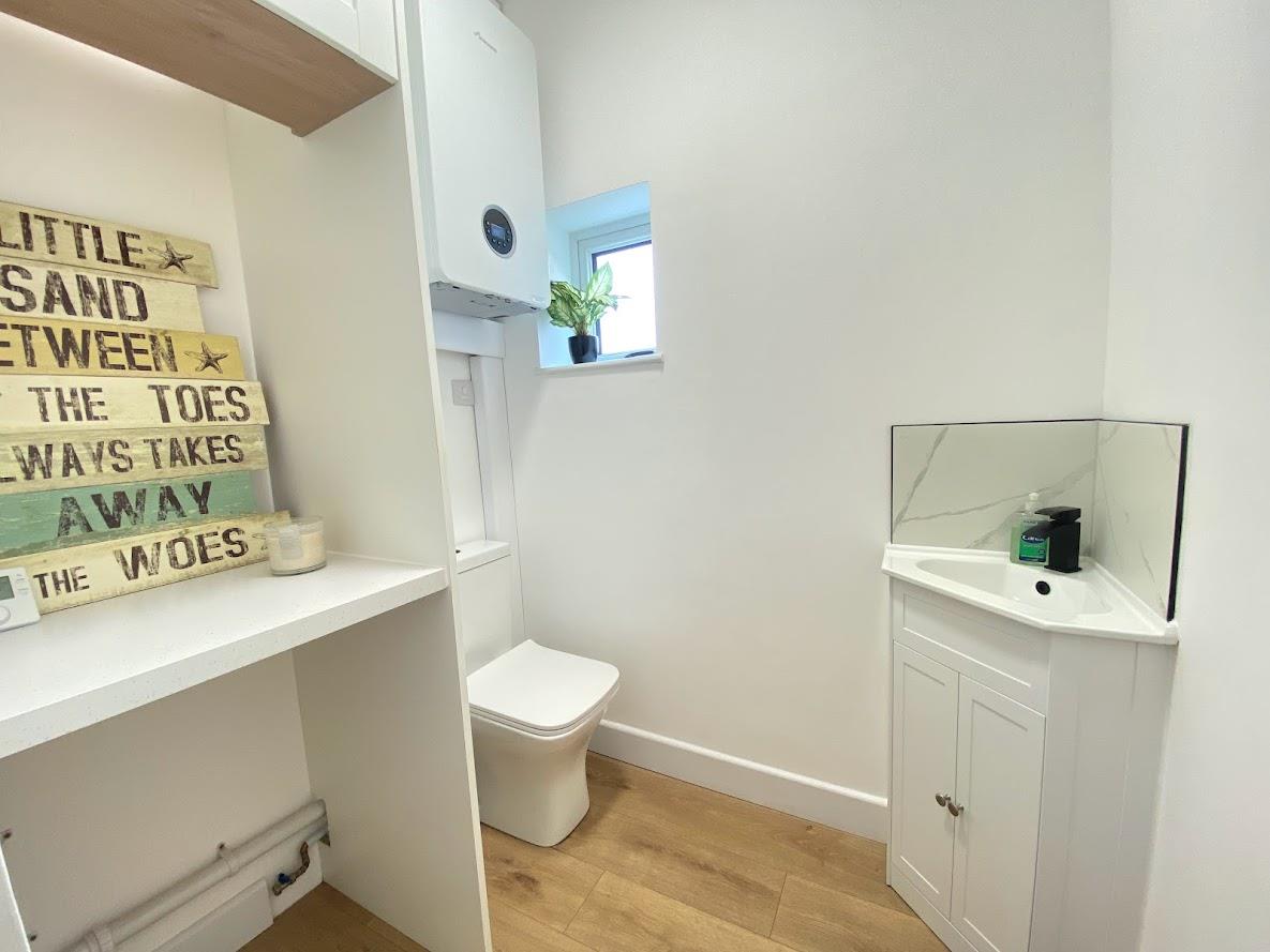 A useful laundry area with plumbing for a washing machine and condensing tumble dryer on top, low level WC, wash basin sat on a corner vanity unit, oak effect laminate flooring, UPVC double glazed obscure window, towel radiator, also housing the brand new Worcester combination boiler.