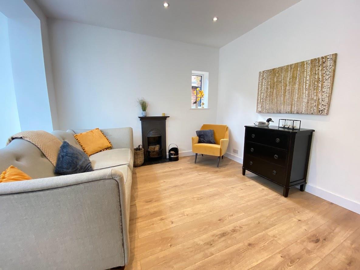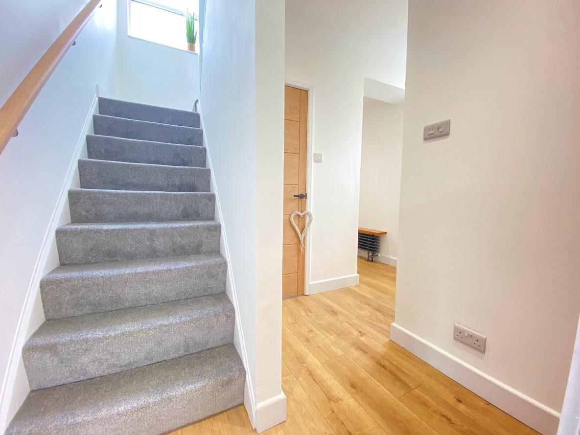 A practical and pleasant formal area accessed through a new composite front door, oak effect laminate flooring, fitted bench seat with radiator, UPVC double glazed obscure window, high ceilings with inset ceiling spotlights, stairs to first floor, tall vertical radiator.
