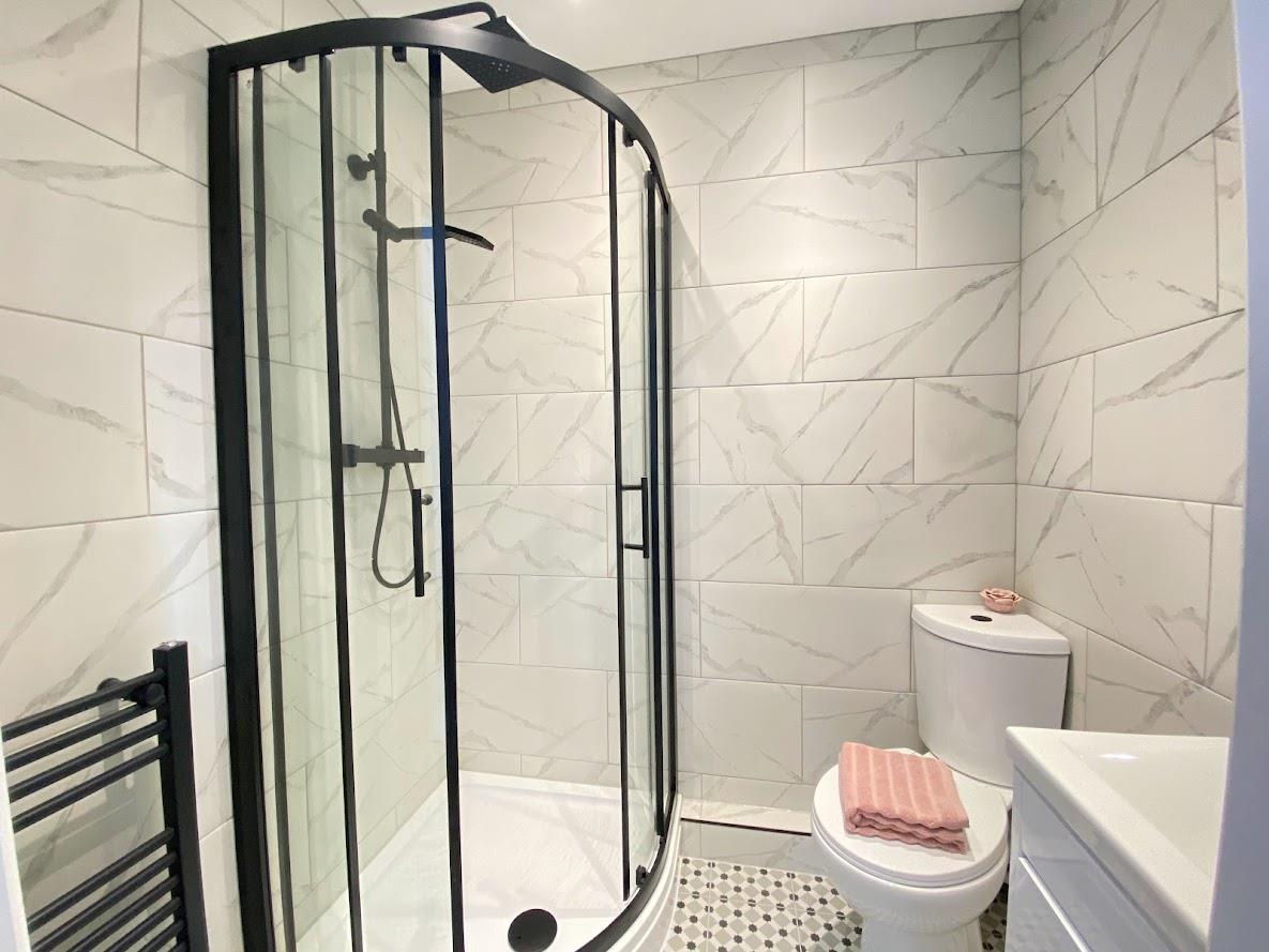 Very stylishly appointed with attractive floor and wall tiling, black fittings throughout, corner shower cubicle with mains over head shower and additional shower head, corner WC and wash basin sat on a two drawer vanity unit, towel radiator, inset ceiling spotlights and extractor fan.