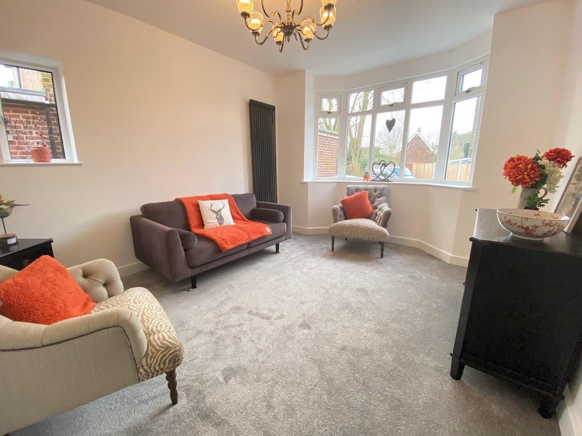 A cosy bay windowed lounge with additional side UPVC double glazed window, media connections, tall vertical radiator.