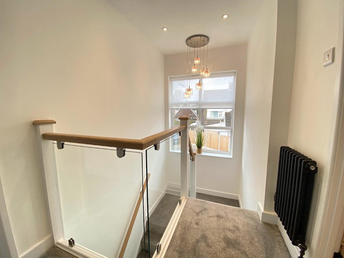Arriving to a very pleasant and stylish area with glazed balustrade and a large UPVC double glazed window with feature light fitting, column radiator, inset ceiling spotlights and loft access.