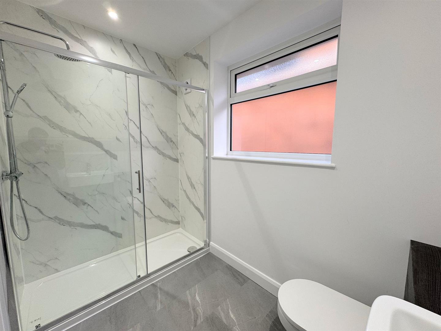 Beautifully appointed comprising a triple width low profile shower tray with sliding screen door, mains chrome overhead shower with additional shower head, marble effect vinyl wall panels, extractor fan, a wash hand basin and low-level WC are both neatly concealed within a vanity unit, attractive vinyl flooring, UPVC double glazed window, inset ceiling spotlights, chrome towel radiator.