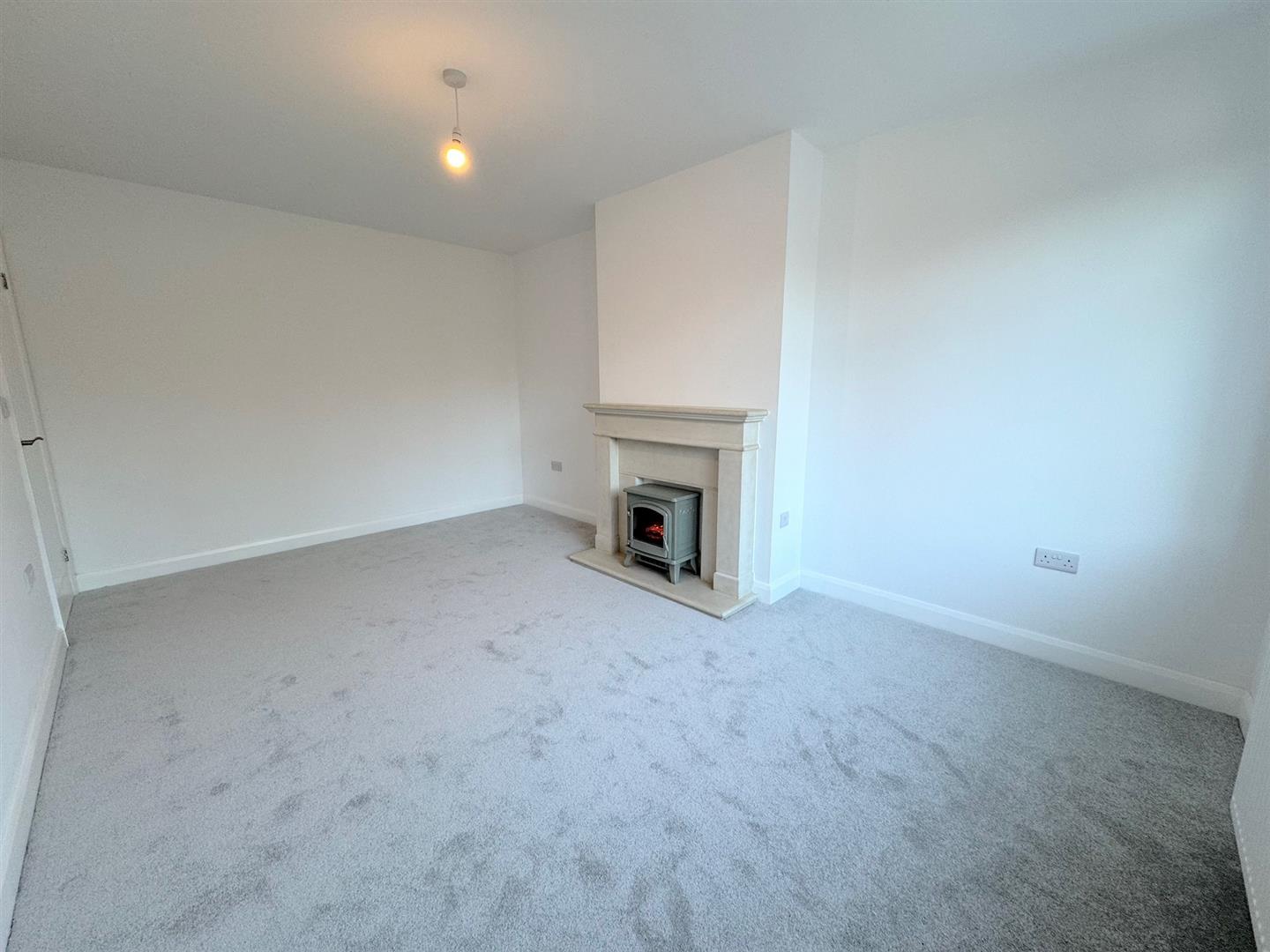 A spacious lounge having a feature fireplace and hearth with an inset log effect burning electric stove, UPVC double glazed window overlooking the rear garden, radiator.