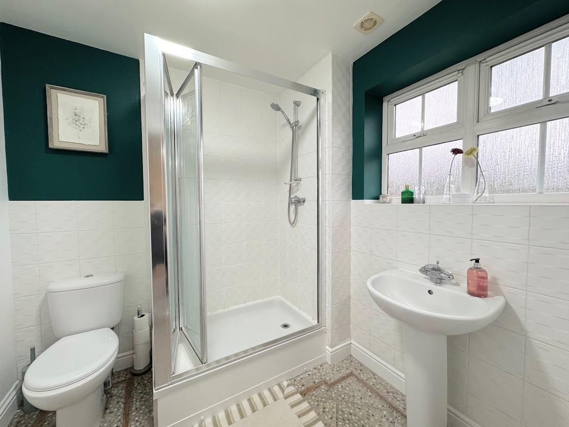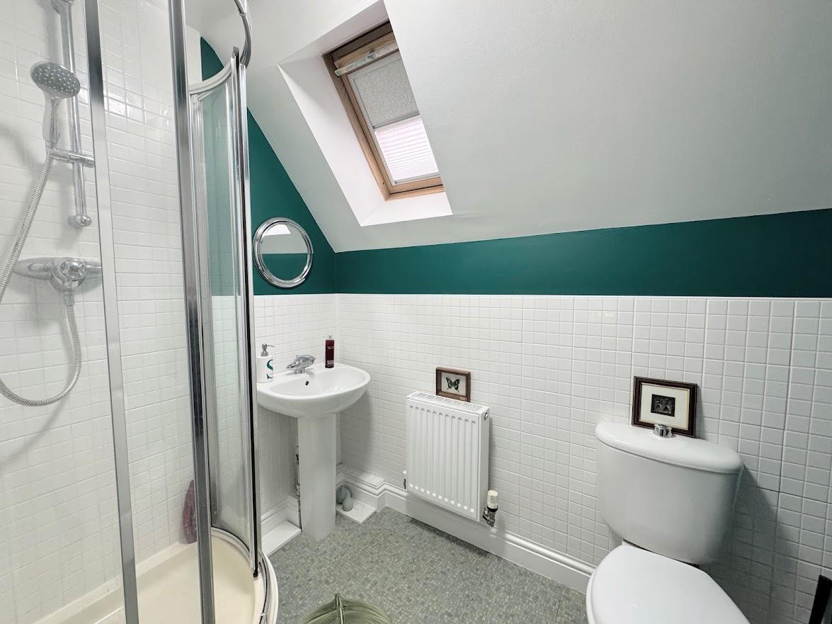 Smartly presented and appointed with a corner shower cubicle with mains shower, wash basin and WC, vinyl flooring, half tiled walls, Velux window, extractor fan, sensor light, radiator.