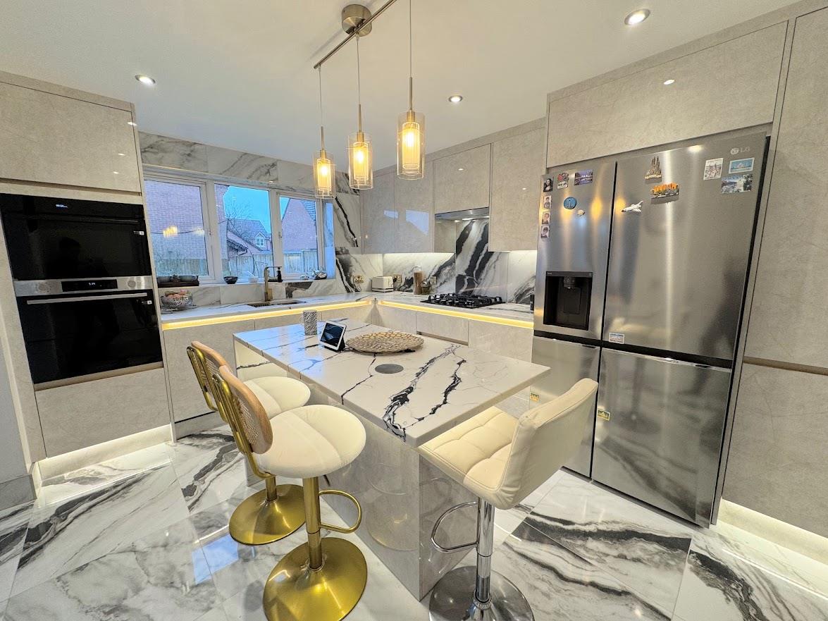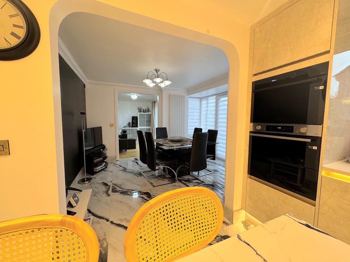The kitchen has been styled with a high-end installation comprising an extensive range of wall, floor and pantry units with a natural stone effect cupboard and drawer front, granite work surfaces, recessed sink, feature splashback and floor tiling matching the hallway, island with breakfast bar and deep pan drawers, Samsung integrated appliances include an electric Wi-fi controlled oven and multi-purpose microwave-air-fryer-oven, gas hob with a concealed extractor fan over, integrated dishwasher, space for an American style fridge freezer, vertical radiator, access into: