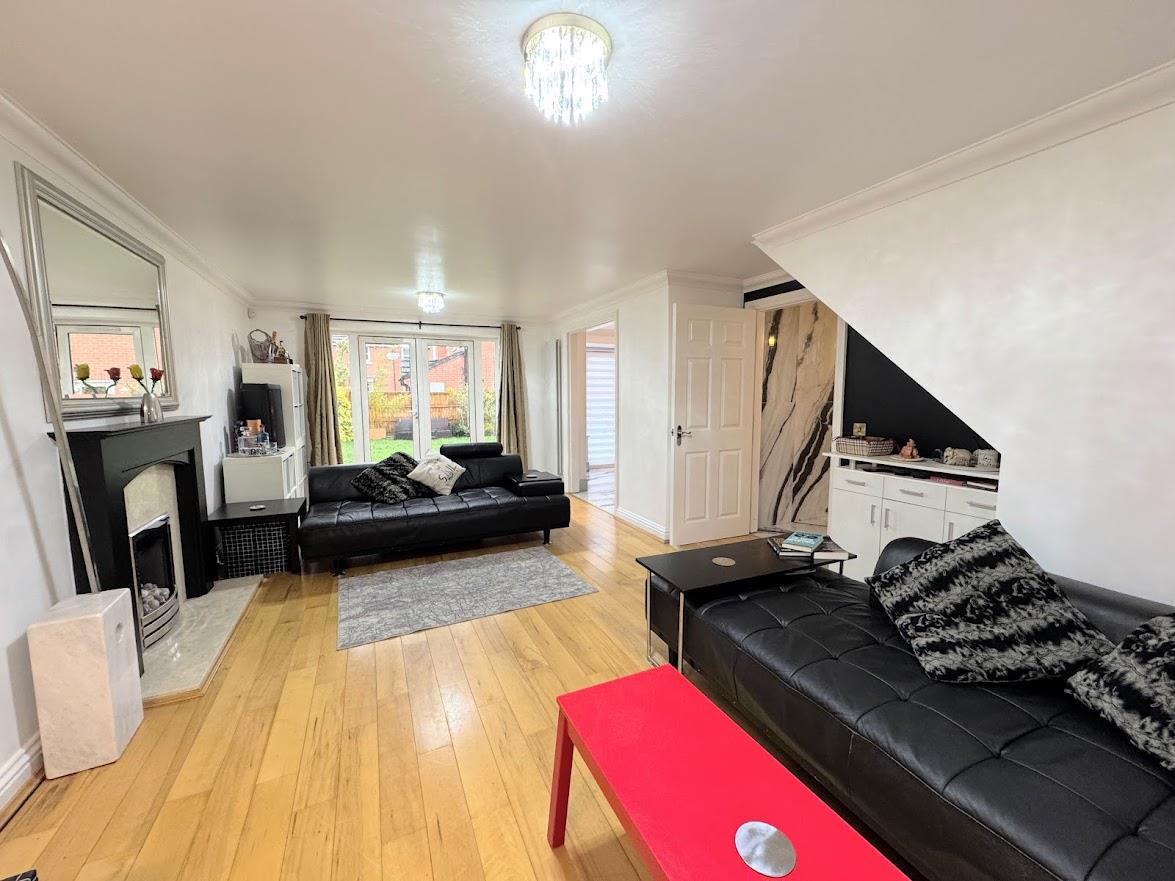 A large, full depth living room, spacious enough for the whole family with wooden flooring throughout, front UPVC double glazed windows and rear French doors, fireplace and inset gas fire, media connections, two vertical radiators, additional access into hallway.