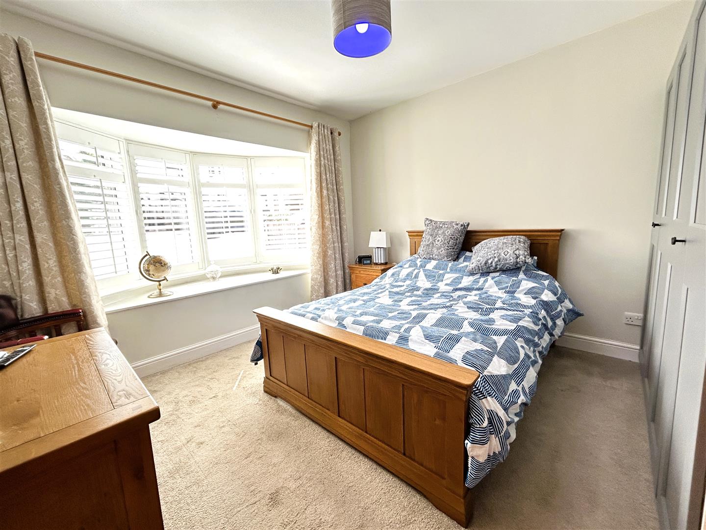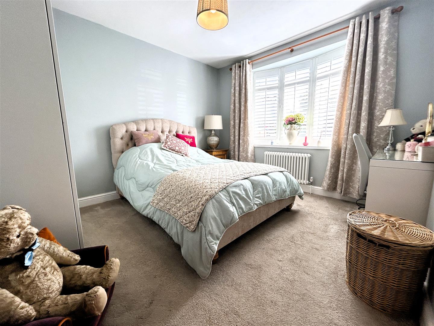 A generous double room with a UPVC double glazed bow window to the front, fitted with shutters, a column radiator and a solid oak door.