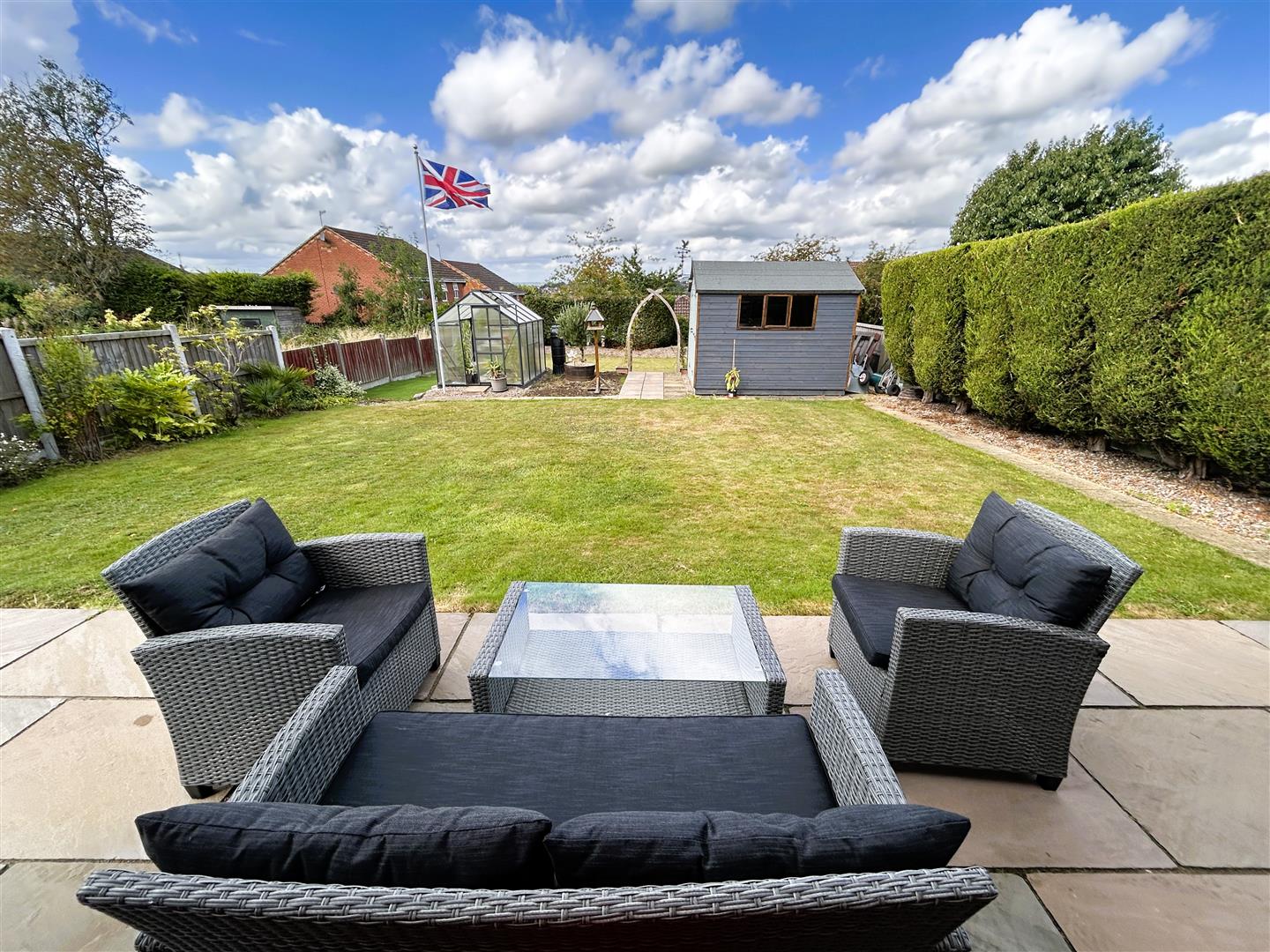 The generous garden is laid to lawn with steps and a rockery garden providing access. There is a paved patio and an impressive Cosy Room garden room, a greenhouse, wooden garden shed, outdoor lighting and tap.