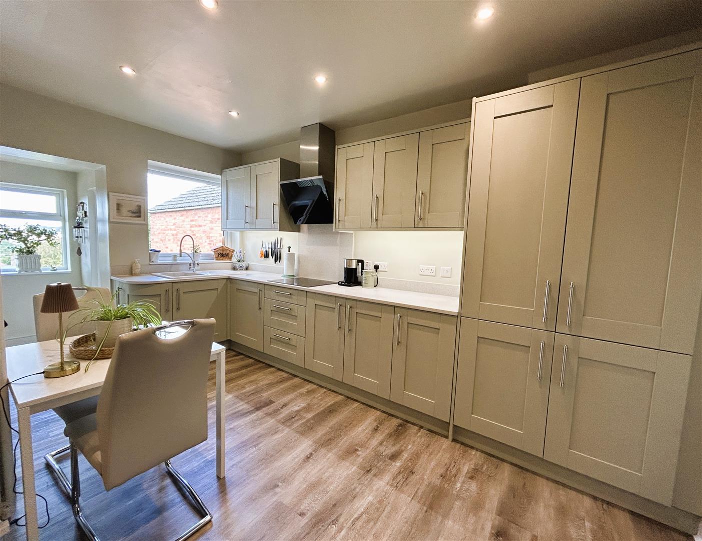 Comprehensively appointed with a quality range of sage coloured base cupboards, drawers, eye level units and larder cupboard with Corian work surface, upstand and splash back. Integrated appliances include an electric oven, combination oven/ microwave, induction hob, extractor hood, automatic washing machine and space for an American fridge freezer. There is a UPVC double glazed window to the rear enjoying views, column radiator, inset spot lighting, under plinth lighting, open into :
