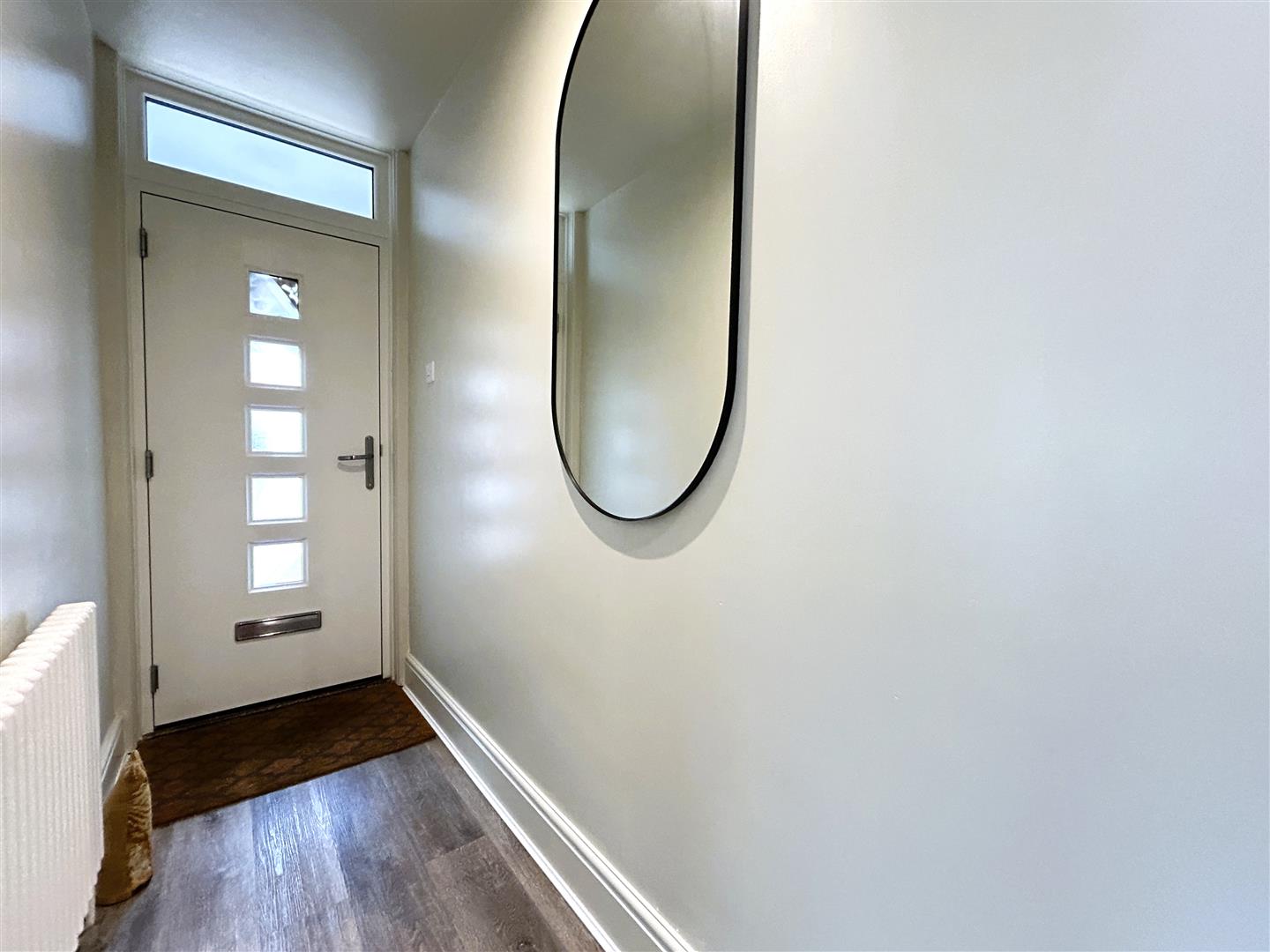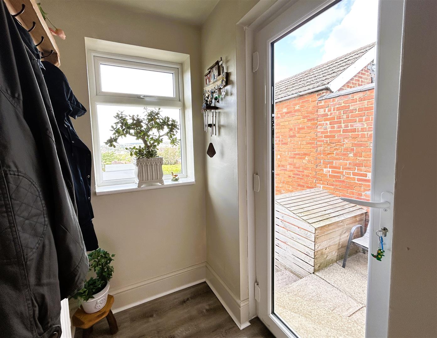 There is a range of coat hangings, column radiator and a half glazed UPVC entrance door opening to the rear.
