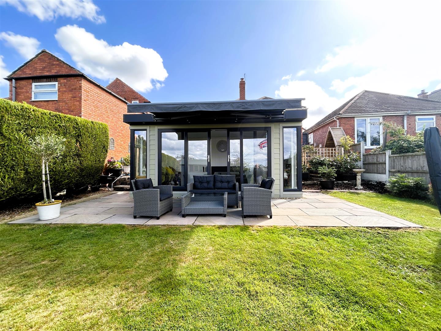 Being fully insulated and constructed from timber with all weather composite cladding, light, power, full height double glazed windows and French doors. There is external power points, retractable sun canopy and a paved patio area, perfect for entertaining.